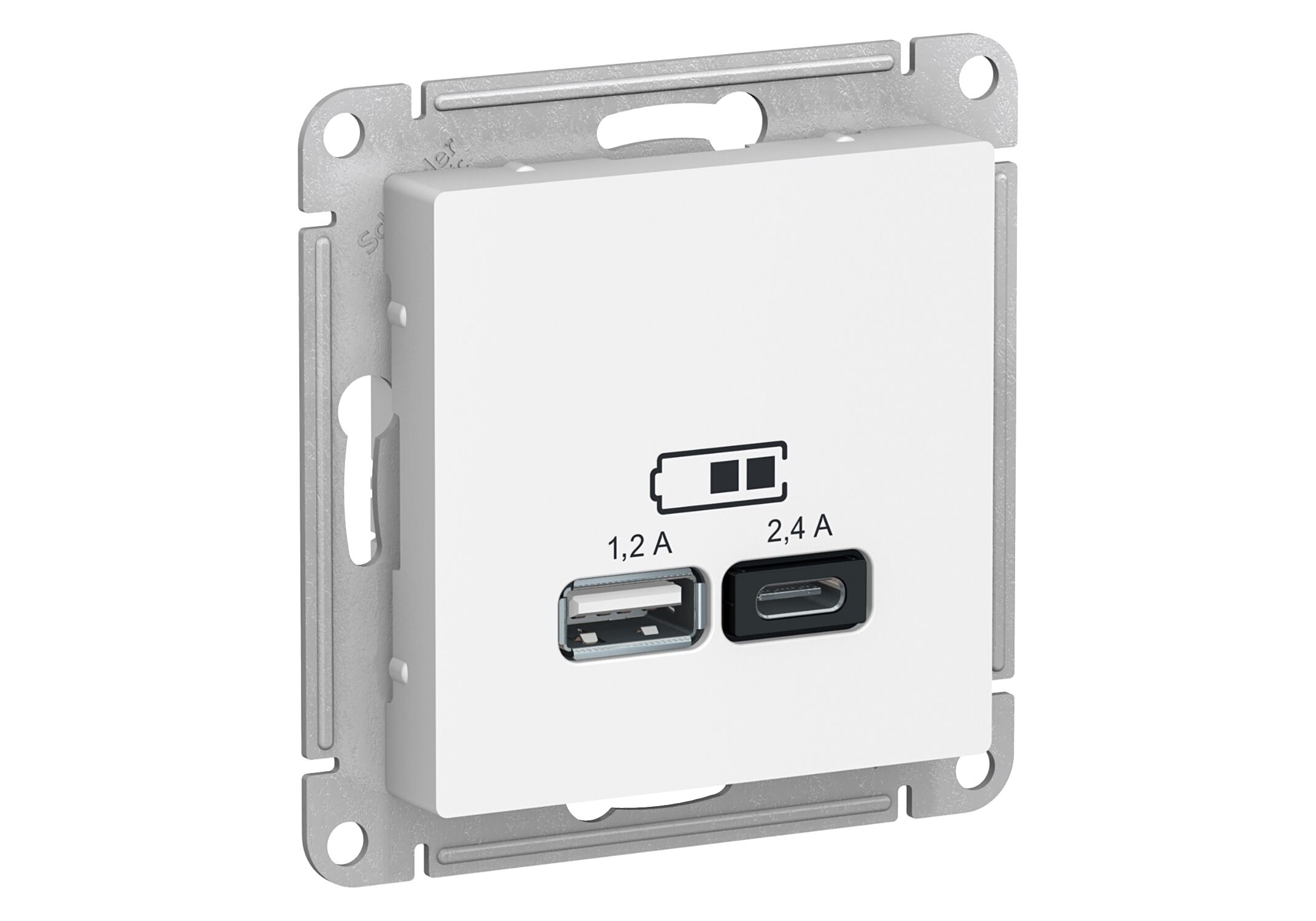 Розетка USB AtlasDesign A+С, 5В/2,4 А, 2х5В/1,2 А, механизм, белый (ATN000139)